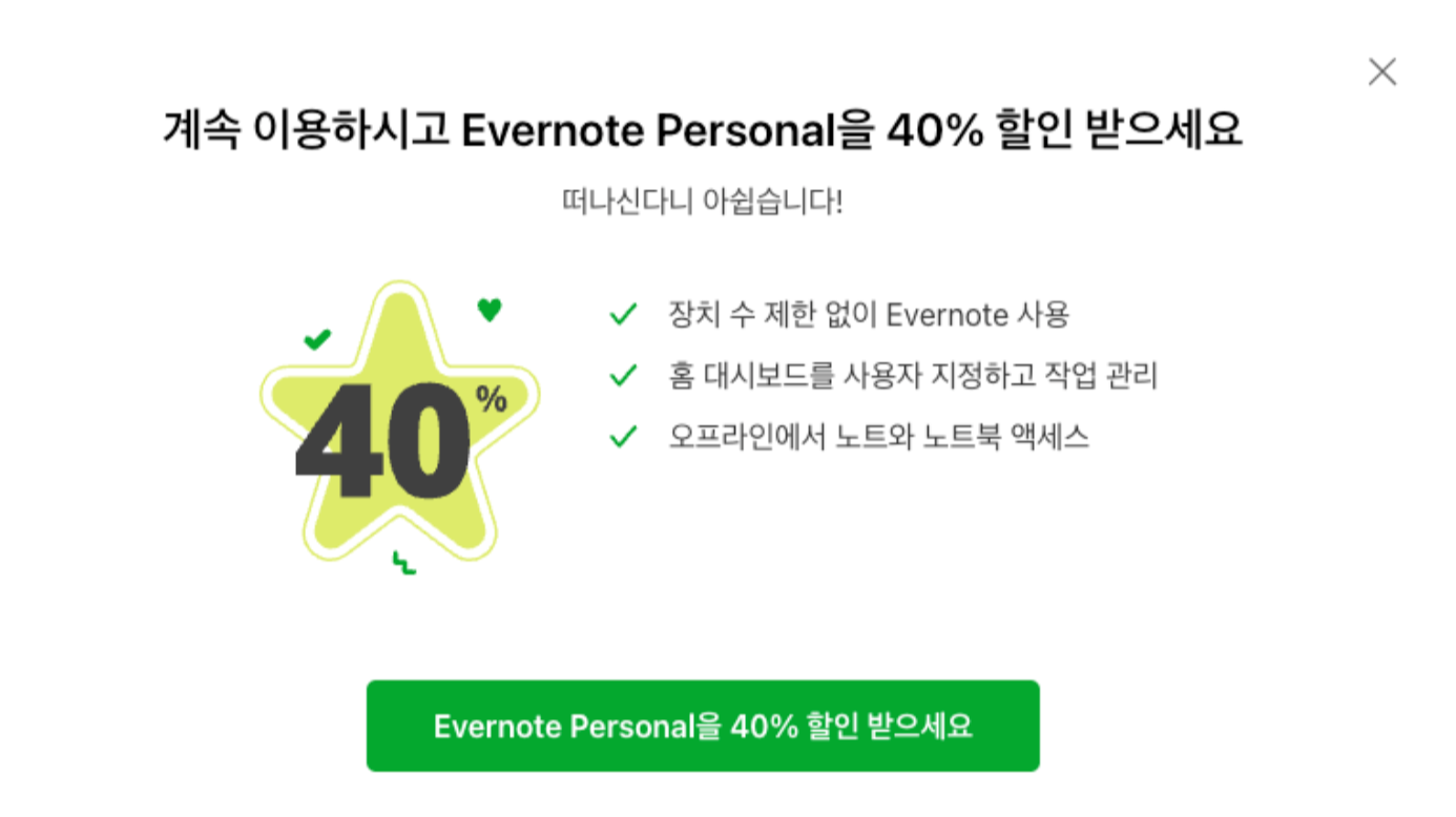 그래서 전 구독을 취소하고 다음달에 ‘앱 내 구입’으로 해서 다시 구독을 해야겠다는 생각으로 취소과정을 거쳤고, 최종 마지막으로 취소를 눌렀는데, 재밌는 문구가 하나 떴습니다. 바로 다시 구독을 하면 40%를 할인해 주겠다는 문구였습니다.