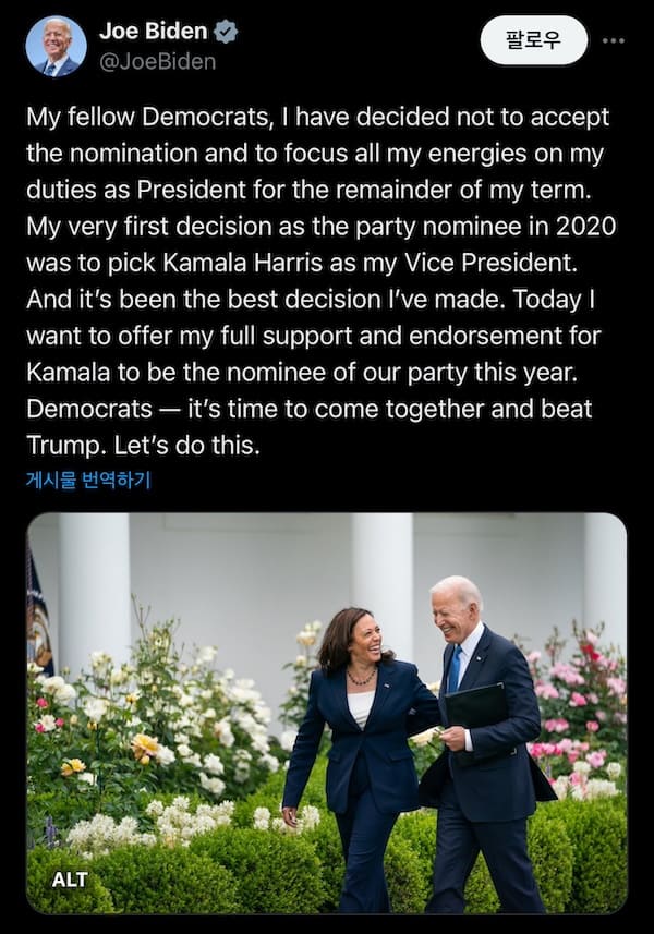 조 바이든 미국 46대 대통령이 민주당 전당대회를 약 1달 정도 남겨둔 시점에서 대선 포기를 선언했습니다. 이는 정확히 도널드 트럼프 공화당 후보가 피격을 당한 지 약 1주일이 지난 시점에 이루어졌습니다.